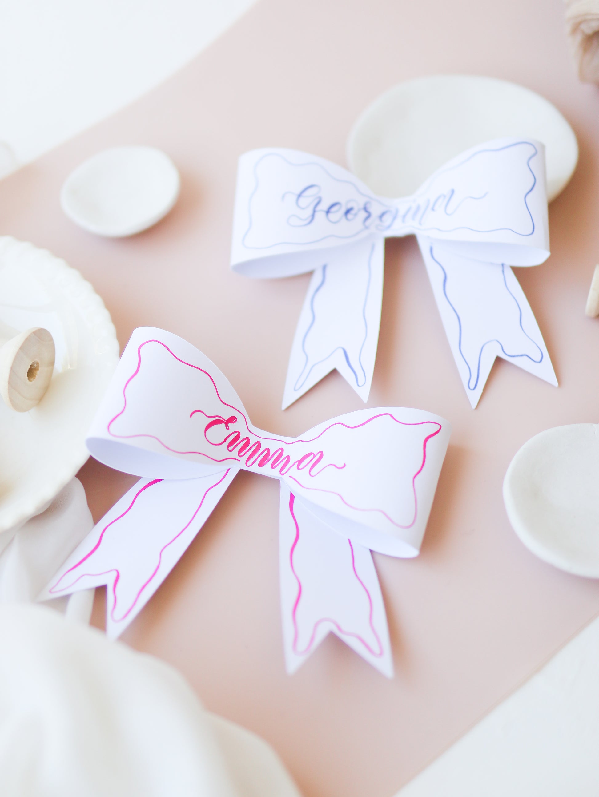 Each one features meticulously HANDWRITTEN calligraphy in a bow style. Add a unique touch to your wedding reception by using personalised paper bows as place cards. It's 3D, and each of them is carefully cut and assembled to create a beautiful bow shape in 3D. It's cute and beautiful, perfect for weddings, bridal showers, hens, baby showers, etc.
