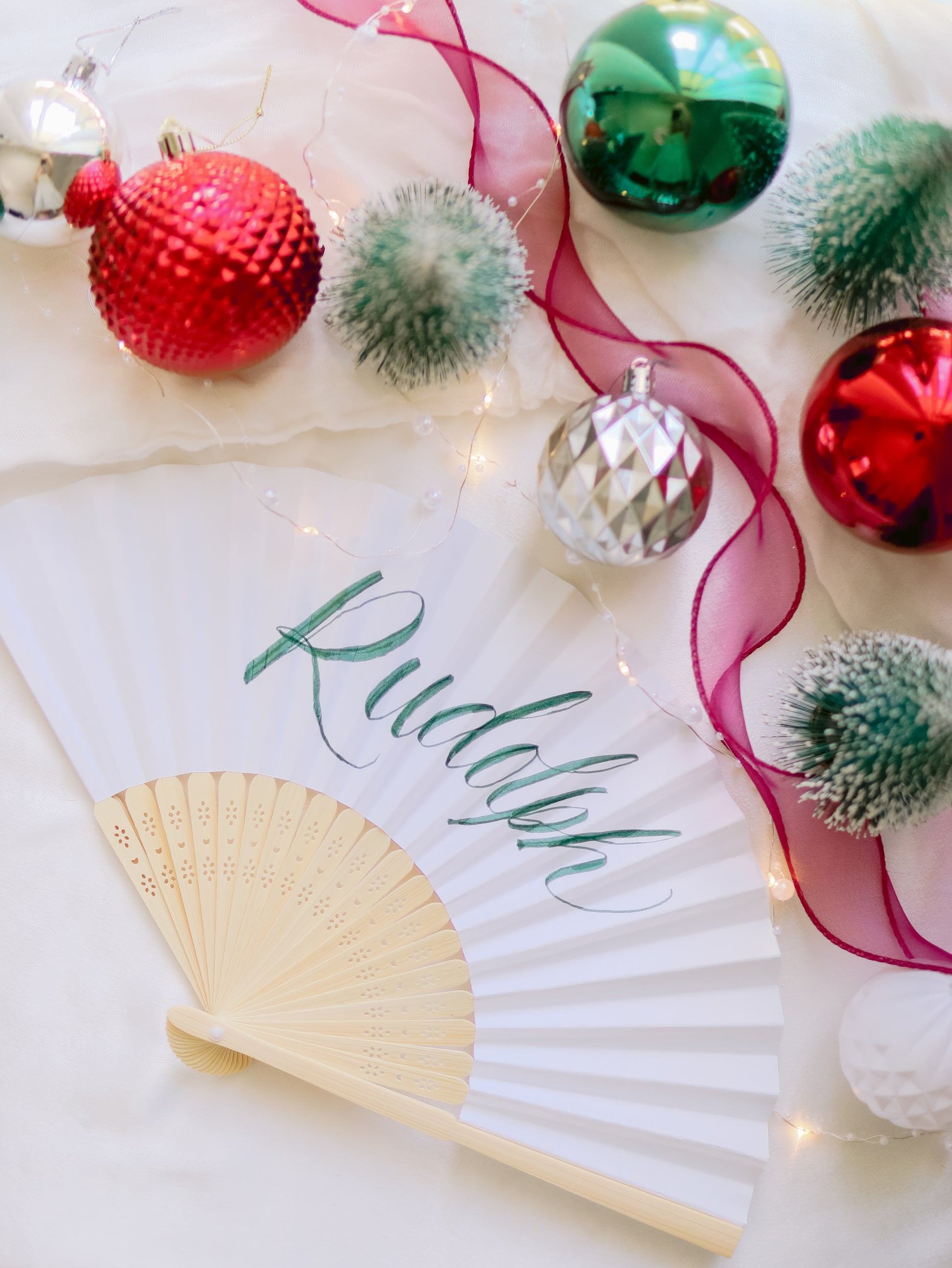 Elevate your Christmas Event with our meticulously crafted hand-written calligraphy on each fan. These personalised paper fans serve as elegant place cards, guiding guests to their seats while adding a touch of sophistication to your event. Not only functional, but these dual-purpose items also provide relief from the heat during the event. Guests will treasure these personalised paper fans as a cherished keepsake from your special day.