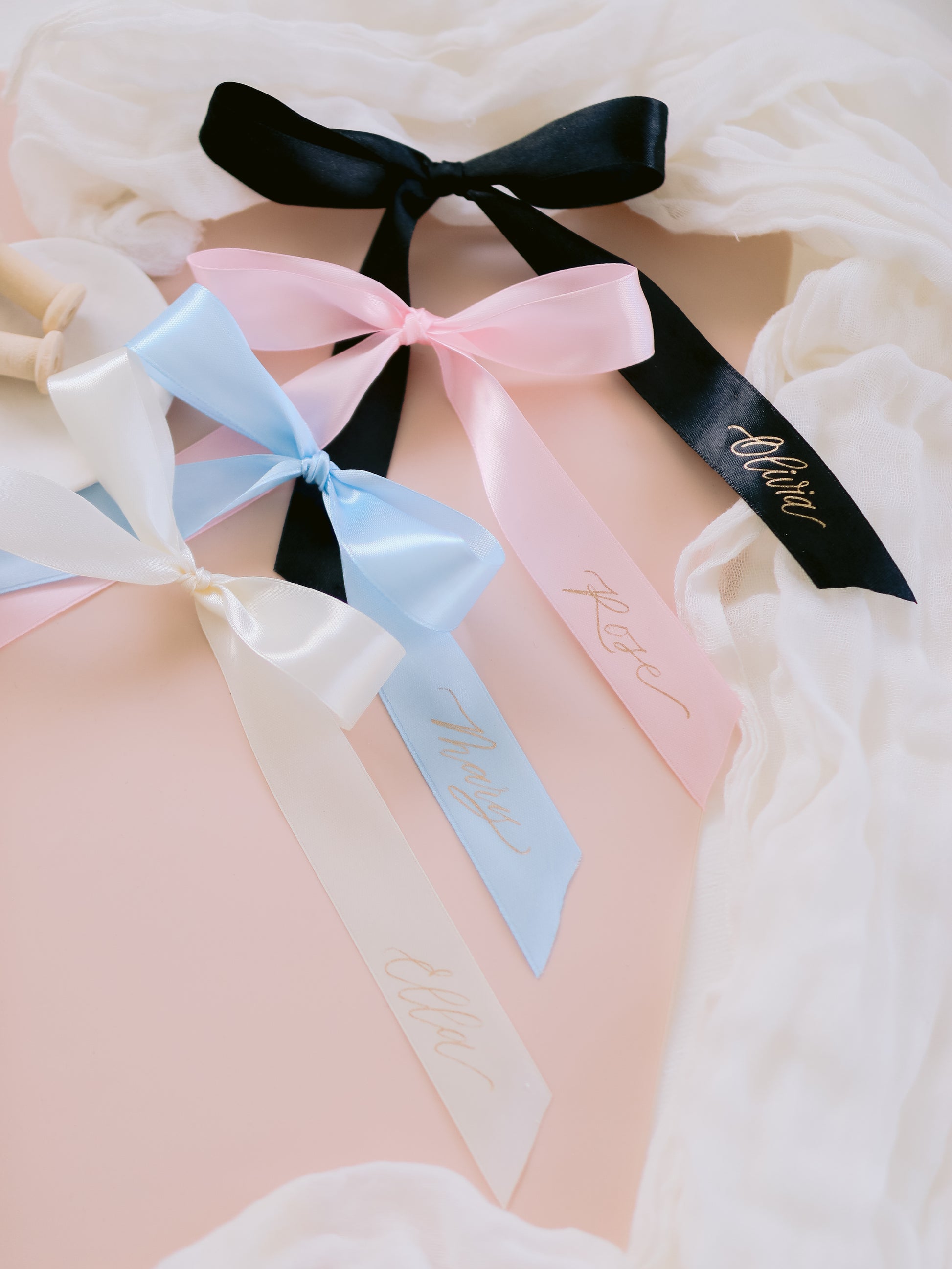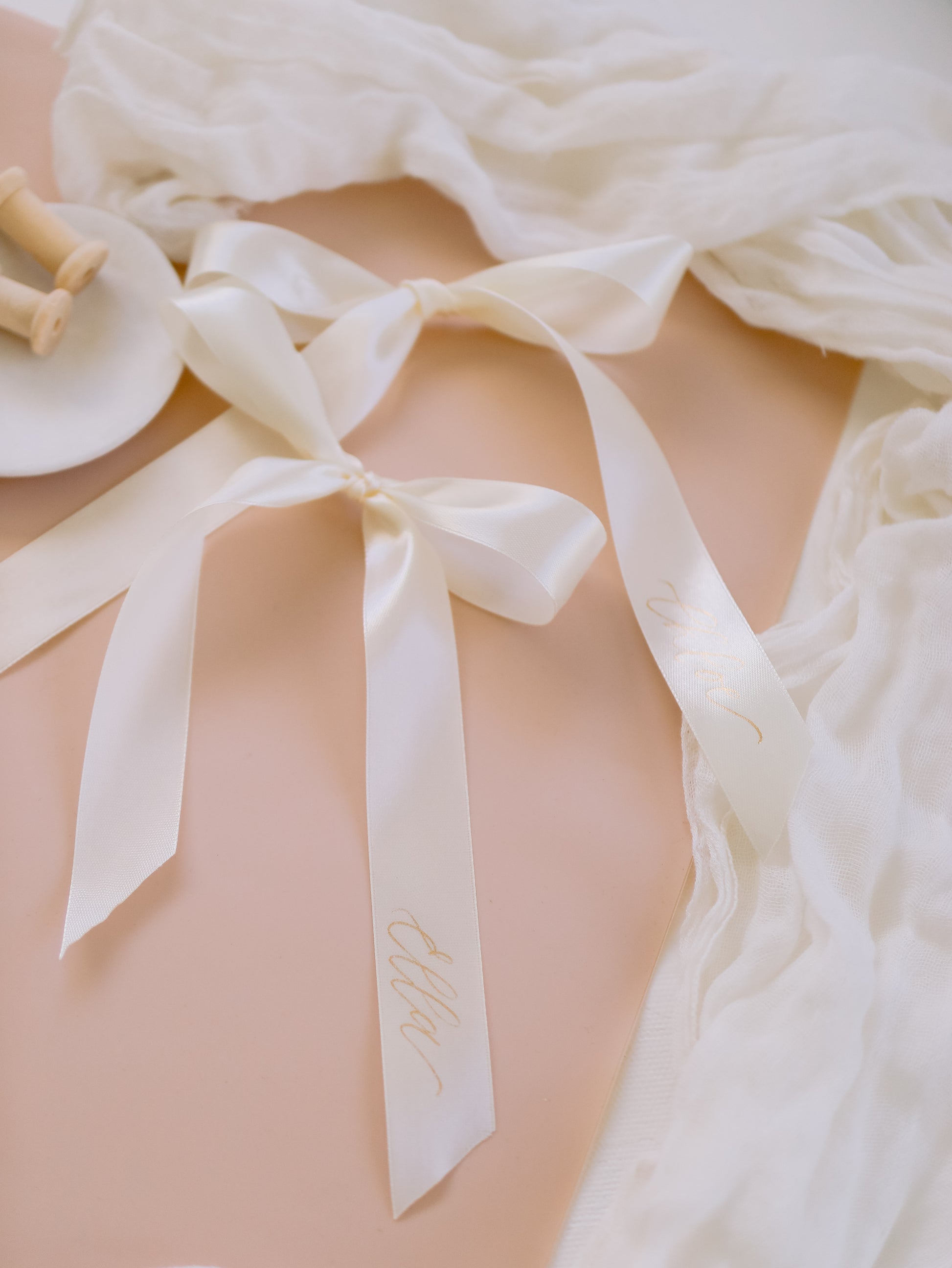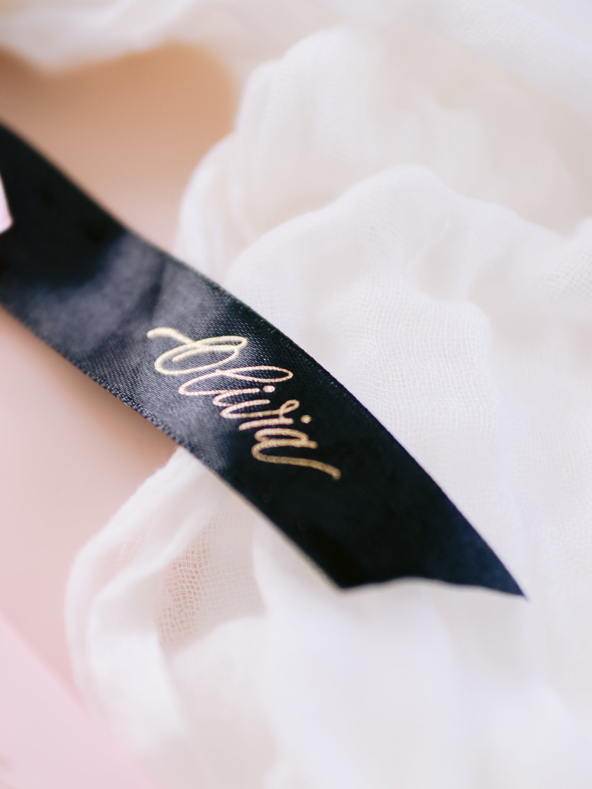 This ribbon features handwritten calligraphy with hot foil that will add a luxurious touch to your wedding or event.