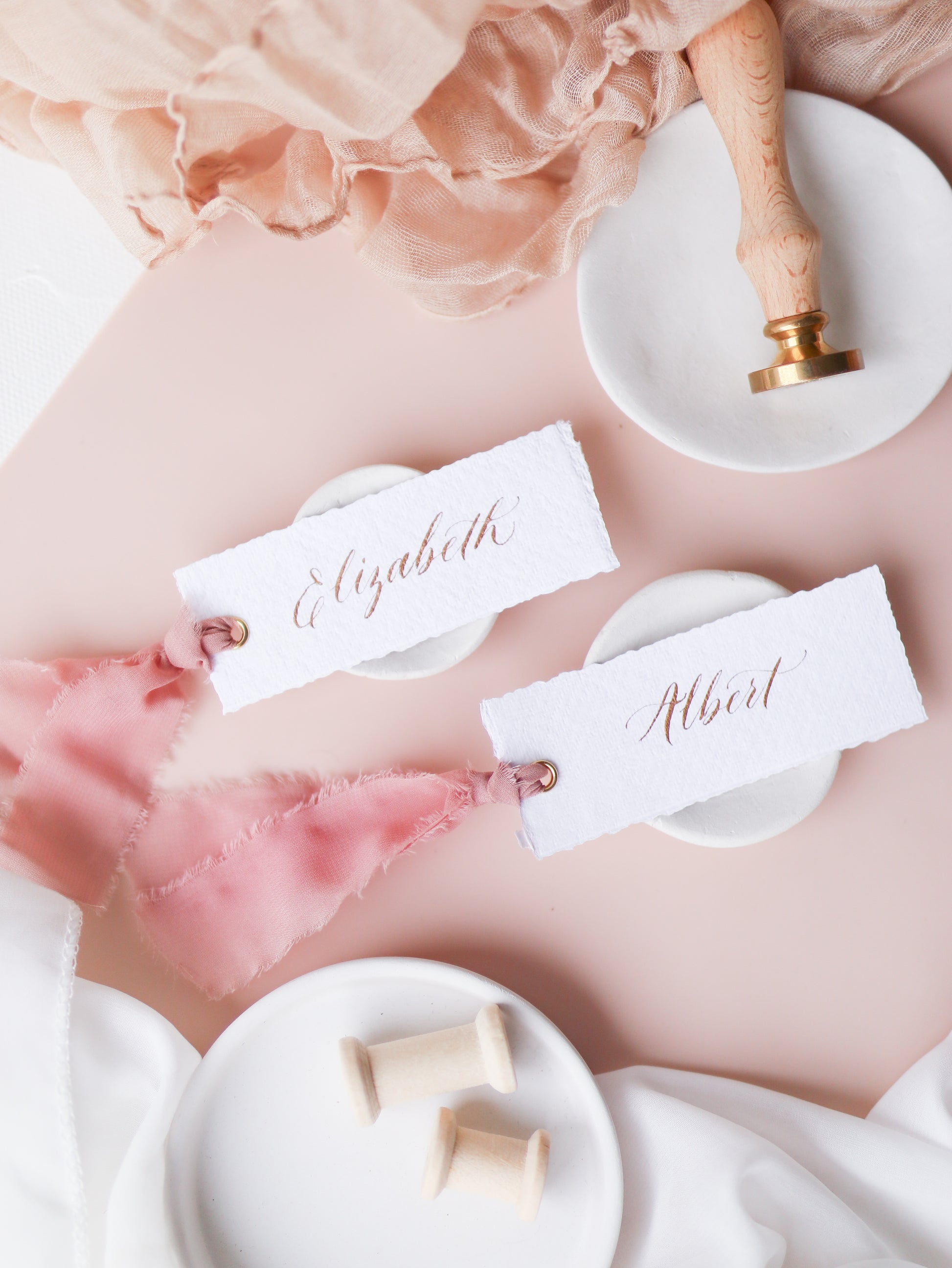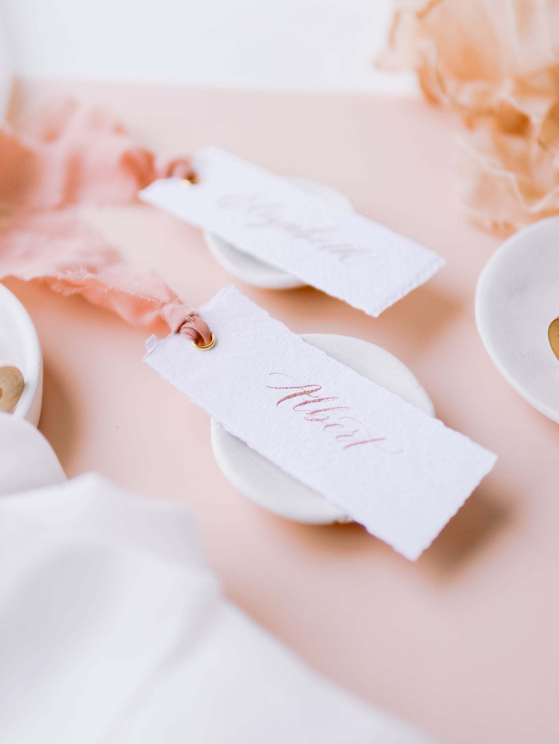 Each place card is accompanied by a beautiful hand-dyed silk ribbon in various colours. Additionally, these place cards are made from indie handmade paper, crafted with 100% cotton for a unique touch.